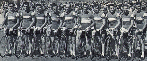L'Équipe de Luxembourg / Mixte au départ de ce 44ème Tour de France 1957. Cinq Luxembourgeois dont un des grands favoris Charly Gaul au centre dans son maillot de champion du Luxembourg