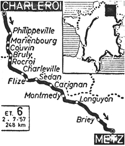 10h00 (BELGIQUE) : Charleroi / rue de Philippeville (km 0) - Nalinnes (km 3) - Somzée (km 8) - N5 Laneffe (km 11) - Fraire (km 13.5) - Yves-Gomezée (km 16) - Jamagne (km 17) - Philippeville (km 20) - Neuville (km 23) - Roly (km 29) - Mariembourg (km 34) - Frasnes (km 36) - Couvin (km 40-CV) - Côte du Bois-Bruly (km 44.5) - Bruly (km 47) - frontière (km 52) - (FRANCE) - (Ardennes) : N385 Gué d'Ossus - N51 Rocroi (km 58-CV) - Trembloi-lès-Rocroi (km 67.5) - Rimogne (km 69.5) - Lonny (km 74.5) - Cliron (km 76) - Tournes (km 78.5) - Charleville (km 87-CV) - Mézières (km 88) - N64 Villers-Semeuse (km 91) - Les Ayvelles (km 93.5) - Elaires (km 94.5) - Flize (km 96) - Dom-le-Mesnil (km 99) - Pont-à-Bar (km 101) - Donchery (km 104) - Sedan (km 109-ravitaillement) - Balan (km 110.5) - Bazeilles (km 112.5) - Douzy (km 117) - N381 Pouru-Saint-Rémy (km 120) - Sachy (km 124) - Wé (km 127) - Carignan (km 129) - Blagny (km 131) - Fromy (km 137) - Margut (km 138) - Montlibert (km 142) - (Meuse) : Thonelle (km 147.5) - Montmédy (km 153) - N47 Iré-le-Sec (km 158.5) - N47 Carr. N405 (km 160) - Marville (km 165.5) - (Meurthe-et-Moselle) : Noërs (km 176.5) - Longuyon (km 178-ravitaillement) - N381 Carr. D18 (km 185.5) - Boismont (km 191.5) - Xivry-Circourt (km 198.5) - Landres (km 204) - N52bis Mainville (km 207.5) - Briey (km 216) - N881 Auboué (km 223.5-CV) - (Moselle) : Marie-aux-Chênes (km 226.5) - Amanvillers (km 231.5) - Châtel-Saint-Germain (km 237.5) - Moulins-lès-Metz (km 240.5) - Longeville-lès-Metz (km 244) - Metz / Bd Poincaré (km 248).