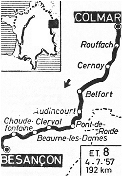 12h00 (Haut-Rhin) : Colmar / Rte de Rouffach (km 0) - N83 Hattstatt / Est (km 7.5) - Pfaffenheim / Est (km 11.5) - Rouffach (km 14) - N83 Carr. N430 (km 24) - Cernay (km 34-CV) - N83 Carr. N66 La Croisière (km 36) - Aspach-le-Bas (km 40) - Soppe-le-Bas (km 47.5) - (Territoire-de-Belfort) : La Chapelle-sous-Rougemont (km 53.5) - Les Errues-près-St-Germain (km 59) - Belfort (km 69-CV) - N19b Danjoutin (km 70) - Sevenans (près de) (km 72.5) - Bermont (près de) (km 73) - N437 Tretudans (km 74) - (Doubs) : Nommay (km 78.5) - Sochaux (km 81) - N437 Carr. 463 (km 82.5) - Audincourt (km 85-CV) - Beaulieu (km 89-CV) - Mandeure (km 92.5) - Mathay (km 96) - Le Fourneau (km 100.5) - Pont-de-Roide (km 102-ravitaillement) - N73 Vermondans (km 104) - Dambelin (km 109.5) - Bermont (km 117.5) - Glainans (km 119.5) - Chaux-les-Clerval (près de) (km 124.5) - Clerval (km 127-CV) - Branne (km 130.5) - Hyèvre-Paroisse (km 135) - La Grande-Ravey (km 140.5) - Baume-les-Dames (km 142) - Sechin (km 148.5) - D30 Pouligney (km 156) - N486 Chaudefontaine (km 161-CV) - D30 Moncey (km 166.5) - D14 Venise (km 169) - Merey (près de) (km 172.5) - Devecey (km 177) - N57 Carr. D1 (km 185) - N57 Carr. D108 Valentin (km 184) - D108 École (km 185) - D108 Carr. N67 (km 187.5) - N67 Besançon / Vélodrome (km 192).