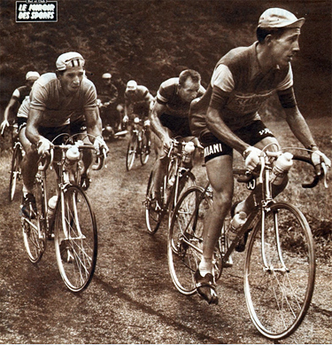 Dans la montée du col de Portet d'Aspet, Anglade est parti à la poursuite de Planckaert Ici Rivière mène devant un Nencini attentif mais un peu isolé.