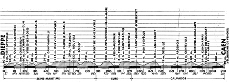 11h30 (Seine-Maritime) : Dieppe/Rue Gambetta (km 0) - N25 Petite Appeville (km 2) - Hautot (près de) (km 5) - Ouville (km 10.5) - Bourg-Dun (km 16) - La Chapelle-sur-Dun (km 19) - Veules-les-Roses (km 22.5) - Saint-Valéry-en-Caux (km 30.5) - Cany-Barville (km 42.5) - D50 Ourville-en-Caux (km 49) - Fauville-en-Caux (km 58.5-CV) - D149 Yebleron (km 63) - Rouville (km 66.5) - Bolbec (km 72.5) - N810 Tancarville (près de) (km 85.5) - Pont de Tancarville (km 86.5) - (Eure) : Sainte-Opportune-la-Mare (km 97.5) - Pont-Audemer (km 105.5-CV) - N180 Toutainville (km 110) - Saint-Maclou (km 114) - N815 Beuzeville (km 119.5) - (Calvados) : Saint-Benoît d'Hébertot (près de) (km 126.5) - Pont-l'Évêque (km 133.5-ravitaillement) - La Queue Devée (km 138.5) - La Haie Tondue (km 140.5) - Hannebault (km 144.5) - Danestal-le-Bourg (km 146.5) - Angerville (km 150.5) - Dozulé (km 152.5) - D49 Putot-en-Auge (km 153.5) - D80 Brocottes (km 156.5) - D78 Le Ham (km 157.5) - St-Pierre-du-Jonquet (près de) (km 161) - D80 Argences (km 166) - Conteville (km 174) - Saint-Aignan-de-Cramesnil (km 177) - D23 Breteville-sur-Laize (km 183-CV) - Laize-la-Ville (km 190) - D41 Clinchamps-sur-Orne (km 192) - Le Pont-du-Coudray (km 194) - Amaye-sur-Orge (km 195.5) - D36 Avenay (km 200) - D8 Eterville (km 206) - N175 Caen/Vélodrome (km 211).