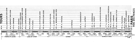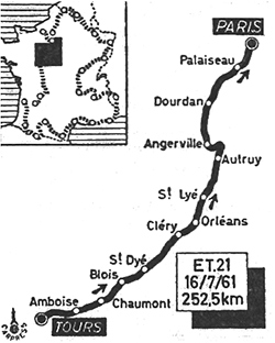 9h50 (Indre-et-Loire) : N751 Tours (km 0) - N751 Montlouis-sur-Loire (km 10.5) - La Barre (près de) (km 12.5) - Lussault-sur-Loire (km 17.5) - Amboise (km 23.5-CV) - Chargé (près de) (km 27) - Mosnes (km 33.5) - (Loir-et-Cher) : Rilly-sur-Loire (km 36.5) - Chaumont-sur-Loire (km 40.5) - Candé-sur-Beuvron (km 47) - N751 Carr. N764 (km 50.5) - Villelelouet (km 51.5) - Chailles (km 54.5) - Blois (km 60.5-CV) - Carr. près de Montlivault (km 70.5) - St-Dyé-sur-Loire (km 74.5) - Muides-sur-Loire (km 78.5) - Nouan-sur-Loire (km 81) - Saint-Laurent des Eaux (km 86) - N751 Carr. N825 (km 89.5) - (Loiret) : Les Trois Cheminées (km 92.5) - Lailly-en-Val (km 94.5) - Cléry-Saint-André (km 101.5) - La Perrière (km 105) - Mareau-aux-Prés (km 106) - St-Hilaire St-Mesmin (km 109.5) - St-Pryvé St-Mesmin (km 112.5) - Orléans (km 116.5-ravitaillement) - D97 Fleury-les-Aubrais (km 119.5) - Mantaran (km 121) - St-Lyé la Forêt (km 134.5) - Le Poteau (km 136.5) - Les Bordes Latrées (km 138.5) - D97 Carr D11 (km 141) - D97 Carr. D133 (km 144) - Bazoches-les-Gallerandes (près de) (km 148.5) - Acquebouille (km 153) - D97 Carr. D 22 (km 156.5) - Autruy (km 162) - (Seine-et-Oise) : D97 Carr. D18 (km 165.5) - D18 Mereville (km 167.5) - D143 Montreau (km 171) - Angerville (km 175.5-CV) - N838 Pussay (km 179.5) - N838 Carr. D21 (km 187.5) - Authon-la-Plaine (km 191.5) - Les Granges-le-Roi (km 200) - N836 Dourdan (km 202.5-ravitaillement) - N838 St-Cyr-sous-Dourdan (km 207.5) - Angervilliers (km 211.5) - N838 Carr. D97 (km 215.5) - N838 Carr. N188 (km 216.5) - N188 Limours (km 217.5) - Gometz-la-Ville (km 223) - Orsay (km 228.5) - Palaiseau (km 234) - D117 Igny (km 237.5) - D117 Carref. N306 (km 238.5) - N306 Bièvres (km 239) - (Seine) : Petit-Clamart (km 242) - (Seine-et-Oise) : N187 Bruyères-de-Sèvres (km 247) - Sèvres (km 248) - (Seine) : Boulogne-Billancourt (km 250) - Paris/Parc des Princes (km 252.5).