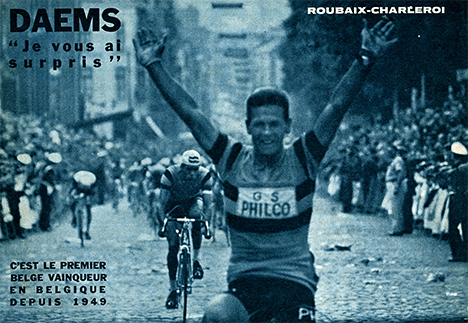 Emile Daems et Aerenhouts ont distancé le peloton dans le dernier kilomètre. Daems s'impose en force sur les pavés de Charleroi.