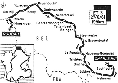 - Après une succession d'escarmouches, une échappée prend corps à Leuve (km 12) avec quatre Belges : Aerenhouts, Daems, Pauwels et Van Aerde mais aussi Junkermann, P. Van Est, Picot, Cloarec, Stablinski & Cazala. A Courtrai (km 18), les fuyards possèdent 20" d'avance. Alors que l'écart est de 30", Anquetil réagit et un deuxième groupe quitte le peloton : Anquetil, Anglade, W. Van Est, Wagtmans, Adriaenssens, Van Geneugden, Hoevenaers, Donike & Milesi. La jonction s'opère au km 31 et ils sont maintenant 19 en tête.