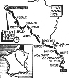 - Au km 41, la situation est la suivante : les deux premiers paquets se sont regroupés, derrière 12 hommes avec Thiélin, Ignolin, Van Tongerloo etc. à 2'30", 17 autres à 5'10" dont les Italiens. Au km 60, c'est Schoubben qui se porte à l'avant sur des routes qu'il connait bien. Il possède 30" au km 62, 1'15" au km 64, 1'40" au km 66 puis l'écart décroit :
