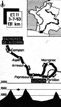 - Un groupe important se détache dès le début d'étape, avec Gabica, Schroeders, Gomez del Moral, Brands, Mattio, Stablinski, Darrigade, Gimmi, Planckaert, Junkermann, Campillo, Pauwel & Ignolin. L'échappée est reprise au km 10. Dans les premières pentes d'Aspin, 6 coureurs - Epaud, G. Desmet 2, Campillo, Ignoli, Mattio & Beuffeuil - tentent leur chance et prennent du champ. A 6 km du sommet, ils ont 2' d'avance. Aux 4 km, Bahamontes accélère avec E. Martin dans un premier temps puis seul part à la poursuite des fuyards. A 2 km du col, il n'est plus qu'à 1'10" du groupe de tête et a distancé le peloton de 1'. A 1 km de la banderole, Beuffeuil est lâché. Au col d'Aspin (km 24.5), les positions sont les suivantes : Ignolin suivi de Mattio en tête, à 3" Epaud, à 15" G. Desmet 2, à 25" Bahamontes, Campillo et Beuffeuil, à 1'40" Martin, à 2'05" le peloton maillot jaune.
