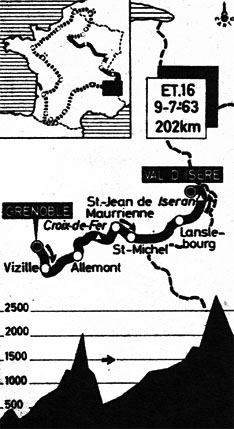 - Les trois Français creusent toujours l'écart qui est maintenant de 4' au km 35 puis 5' à Rochetaillée (km 38), 6'30" à Le Rivier (km 51) marquant le début de la difficile ascension de La Croix-de-Fer. En tête, Joseph Groussard est décroché au moment où Stablinski abandonne. Le peloton monte au train. Bahamontes porte une première attaque à 3 km du sommet, suivi par Poulidor, mais Anquetil, aidé par Geldermans et Ignolin, revient. L'Espagnol ne réussit à se dégager qu'à 1500 mètres du sommet. Au col (km 68), Mattio et Epaud en tête, à 2'30" J. Groussard, à 3'30" Bahamontes, à 3'35" Poulidor, à 3'40" Ignolin, Anquetil, A. Desmet, Pacheco, Soler, à 3'50" Perez-Frances, Battistini, Mahé, Van Schil & Fontona, à 4' Gabica, Manzaneque, Junkermann, Cazala, Brands, Lebaube, Geldermans & Anglade, à 4'30" Hoevenaers, à 4' 35" Van Looy et le maillot jaune G. Desmet 1.