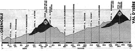9h10 (Isère) : Grenoble (km 0) - Eybens (km 2.5) - Tavernolles (km 5.5) - Brie-et-Angonnes (km 9) - Vizille (km 13.5) - Séchilienne (km 21.5) - Livet-et-Gavet (km 32) - Rochetaillée (km 38.5) - La Fonderie-d'Allemont (km 41.5) - Le Rivier (km 51.5) - (Savoie) : Col de la Croix-de-Fer (km 68-GPM1) - Saint-Sorlin-d'Arves (km 75.5) - Le Chambon (km 78.5) - St-Jean-de-Maurienne (km 98.5) - St-Michel-de-Maurienne (km 112.5) - Le Pra (km 122) - Le Freney (km 125.5) - Fourneaux (km 127.5) - Modane (km 129.5) - Villarodin-Bourget (près de) (km 132.5) - Le Verney (km 140) - Sollières-Sardières (près de) (km 144.5) - Termignon (km 146.5) - Lanslebourg (km 152.5-ravitaillement) - Lanslevillard (km 154.5) - La Magdeleine (km 159.5) - Bessans (km 164.5) - Bonneval-sur-Arc (km 171.5) - Col de l'Iseran (km 184.5-GPM1) - Val-d'Isère / Av. des téléphériques (km 202).