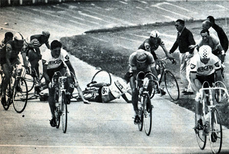 Entrée tumultueuse du peloton sur la piste du stade. Gainche et J. Groussard à terre. Heureusement les premiers sont bien passés.