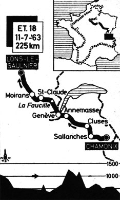 - Les 76 coureurs quittent Chamonix à 10 heures. Il pleut jusqu'à Le Fayet-St-Gervais (km 19) où le peloton passe groupé. Il le restera longtemps et les coureurs prennent un peu de retard sur l'horaire : 11' au pied du col de la Faucille que le peloton aborde groupé.