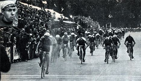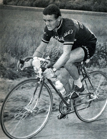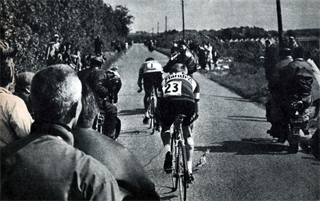 Jacques Anquetil vient de dépasser Armand Desmet et fonce vers la victoire.