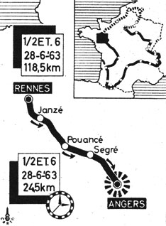 - Au km 44, à la sortie de Martigné, Manzaneque démarre et il est contré par Novak. Une échappée plus sérieuse se produit avant Pouancé au km 57 lorsque Duez et Barale entrent en Anjou. ils resteront devant jusqu'au km 68. Dans le peloton Van Looy est souvent en queue et crèvent par deux fois (km 68 et 75) Il reviendra sans conséquence alors que devant les tentatives se succèdent : Melckenbeeck (km 80), Darrigade, Van Schil, Derboven, Sorgeloos, Ottaviani & Foré au km 85, Vannitsen au km 98 soit à 20 km de l'arrivée mais les co-équipiers d'Anquetil et d'Elliott les musèlent.