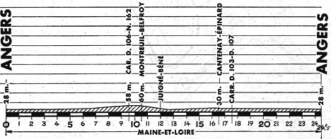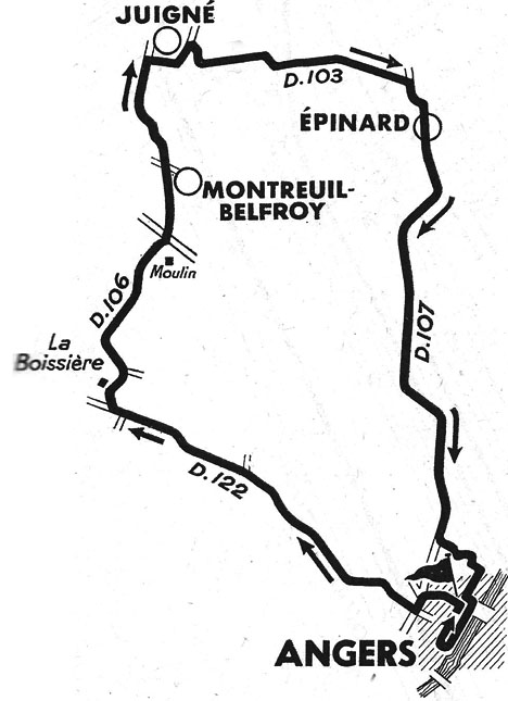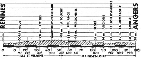 8h30 (Ille-et-Vilaine) : Rennes (km 0) - La Hallerais (km 4) - Vern-sur-Seiche (km 7.5) - Cotelay (km 9.5) - Corps-Nuds (km 15) - Janzé (km 22) - Le Theil-de-Bretagne (km 29) - Retiers (km 33) - Martigné-Ferchaud (km 43.5) - (Maine-et-Loire) : La Touche (km 52) - Pouancé (km 58.5) - Vergonnes (km 65) - Le Grée (km 70) - Bel-Air (km 73) - Noyant-la-Gravoyère (km 75.5) - La Maison-Neuve (km 80.5) - Segré (km 82.5) - La Chapelle-s.-Oudon (km 85.5) - Andigné (km 90) - Le Lion-d'Angers (km 96.5) - Grieul (km 100.5) - La Membrolle-s.-Longuenée (km 104.5) - Avrillé (km 113.5) - Angers / circ. de la Pl. de La Rochefoucauld (km 118.5).