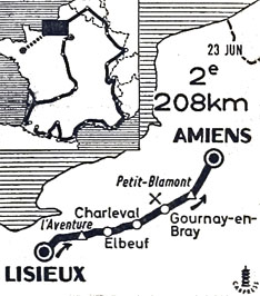 - Fantinato passe en tête à Lyons la Forêt pour une prime. Il précède le peoton de 20" Franchi, Babini, Manzaneque, Nédelec, Hoevenaers, Verbeeck et le petoton de 30". Le regroupement s'opère au km 117. De Haan, Stablinski, Anglade, Simpson tentent leur chance au km 138 à la sortie du ravitaillement, au km 152 c'est Van Tongerloo, Geldermans, au km 155 Rostollan, Stablînski, G. Groussard, Poulot, Bracke, G. Desmet 2, Minieri. La côte du Petit-Blamont au km 169.5 est franchie en tête pa Poulot. Au km 183 Novak qui résistera 2 kilomètres, du km 188 au km 190 Van Tongerloo, Minieri, Janssen, Brands, Hoban, Mattio, du km 195 au km 197 Lefebvre, Stablinski, G. Groussard, Anastasi, Aerenhouts, du km 200 au 207, la dernière avec Adorni, Simpson, Janssen, Bocklant, Boucquet puis Sels, Darrigade, Beheyt, Junkermann.