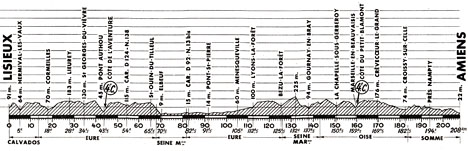 11h20 (Calvados) : Lisieux (km 0) - Hermival-lès-Vaux (km 5) - (Eure) : Saint-Pierre-de-Cormeilles (km 17) - Cormeilles (km 18) - Lieurey (km 28) - St-Georges-du-Vièvre (km 34.5) - Saint-Grégoire-du-Vièvre (km 38) - Berquerie (km 42.5) - Pont-Authou (km 43.5) - Côte de l'Aventure (km 45.5-GPM4) - Bonneville-Aptot (km 48) - Boissey-le-Châtel (km 51) - Bourgtheroulde (km 59.5) - Bosc-Roger (km 62.5) - Saint-Ouen-du-Tilleul (km 65.5) - (Seine-Maritime) : Elbeuf (km 70.5) - Saint-Aubin-lès-Elbeuf (km 72.5) - Fréneuse (près de) (km 77.5) - Sotteville-sous-Le Val (km 80.5) - (Eure) : Igoville (km 82) - Alizay (km 83.5) - Romilly-sur-Andelle (km 90) - Pont-Saint-Pierre (km 91.5) - Douville-sur-Andelle (km 93.5) - Radepont (km 96.5) - Fleury-sur-Andelle (près de) (km 100.5) - Charleval (km 102.5) - Ménesqueville (km 105) - Rosay-sur-Lieure (km 107.5) - Lyons-la-Forêt (km 112.5) - Beauficel-en-Lyons (km 116) - Fleury-la-Forêt (km 119.5) - Bosquentin (km 122) - Bézu-la-Forêt (km 125.5) - (Seine-Maritime) : Gournay-en-Bray (km 137.5-ravitaillement) - Ferrières-en-Bray (km 138.5) - (Oise) : La Chapelle-sous-Gerberoy (km 150.5) - Marseille-en-Beauvaisis / Côte du Petit-Blamont (km 169.5-GPM4) - Haute-Epine (près de) (km 163.5) - Crèvecœur-le-Grand (km 169.5) - Catheux (km 175.5) - Fontaine-Bonneleau (km 178) - Croissy-sur-Celle (km 182.5) - (Somme) : Nampty (près de) (km 194) - 208 J Amiens / circ. La Hotoie (km 208).