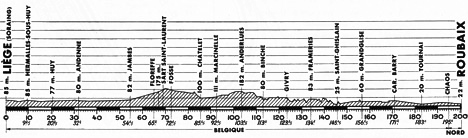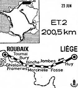 10h05 (BELGIQUE) - Liège - Seraing (km 0) - Engis - Hermalle-s-Huy (km 9.5) - Huy (km 20.5) - Ben Ahin - Andenne (km 32) - Thon - Jambes (km 54.5) - Namur - Floreffe (km 65) - Sart Saint-Laurent (km 69) - Fosse (km 72.5) - Vitrival - Châtelet (km 85.5) - Marcinelle (km 92.5) - Anderlues (km 103.5) - Binche (km 113) - Givry (km 123.5) - Frameries (km 134) - Paturages - Hornu (km 142.5) - Saint-Ghislain km 145.5-ravitaillement) - Tertre (km 147.5) - Hautrage (km 151) - Grandglise (km 156.5) - Basècles (km 160) - Carref. Barry (km 171) - Gaurain - Ramecroix (km 176) - Tournai (km 183) - Templeuve / douanes (km 192) - Chaos - (FRANCE) - (Nord) : Toufflers - Lannoy -Lys-les-Lannoy - Roubaix / vélodrome (km 200.5).