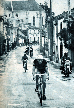 - C'est au km 91 (Geneston) que, sous la pluie, se dessine la grande offensive du jour, voire de ce début de Tour. Sels fausse compagnie au peloton et se voit d'abord renforcé par Van Espen puis en bloc par Elorza, Gustaaf De Smet, Gilbert Desmet 1, Vandekerckhove, Wolfshohl, Otano & Lefebvre le seul Français. Wolfshohl, équipier de Poulidor, ne ménage pas sa peine, et au km 142, les échappés comptent 1'45" d'avance sur le peloton groupé. L'écart se creuse lentement car les Italiens, voulant garder le maillot jaune, essayent de contrecarrer cette échappée et travaillent... à la grande satisfaction de Poulidor. Même Adorni va tenter de partir seul à la poursuite des fuyards mais la réaction de peloton l'oblige à se relever. Au km 185, un groupe de contre-attaque se dégage du peloton comprenant Denson, Ronchini, Gomez del Moral, Mendiburu & Karstens. Ils ne parviendront pas à effectuer la jonction avec le groupe de tête.