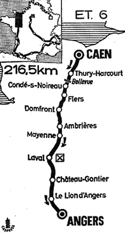 9h25 (Calvados) : Caen (km 0) - St-Martin de Fontenoy (km 5.5) - May sur Orne - Laizé la Ville (km 9) - St-Laurent de Condel - Croisilles (km 17) - Thury-Harcourt (km 21) - Courmont sur Orne - Saint-Rémy (km 30.5) - Clécy (km 33.5) - Côte de Bellevue (km 36.5-GPM4) - St-Denis de Méré - Condé sur Noireau (km 42) - (Orne) : Le Pont de Véré (km 49.5) - Flers (km 54) - La Chapelle-au-Moine (km 58) - La Crétine (km 60) - Le Chatellier (km 62) - St Bômer les Forges - Domfront (km 74) - Céaucé (km 82) - Le Bordage (km 89) - (Mayenne) : Ambrières le Grand (km 98) - La Haie Traversaine (km 101) - Mayenne (km 109-sprint) - Moulay (km 114) - Martigné (km 123) - Louverné (km 132) - Niafles (km 134.5) - Laval (km 139-ravitaillement) - L'Huisserie (km 144) - Entrammes (km 151.5) - Château-Gontier (km 171.5) - L'Aillerie - (Maine-et-Loire) : La Haie - Peuvignon - Le Lion d'Angers (km 193.5) - Grieul - La Mambrolle sur Longuenée (km 201.5) - Avrillé (km 210.5) - Angers / Av. Jean Joxé (km 216.5).