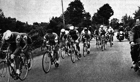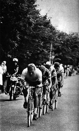 Poulidor a lancé sa 2ème attaque, ses équipiers Bellone et Bodin mènent vigoureusement, suivis par