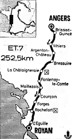 8h20 (Maine-et-Loire) : Angers - Les Ponts-de-Cé (km 0) - Érigné (km 1) - Brissac-Quincé (km 9) - Notre Dame d'Allençon (km 15) - Chavagnes les Eaux (km 18.5) - Martigné-Briand (km 23) - Aubigné (km 26) - Montilliers (km 30) - Vihiers (km 35) - (Deux-Sèvres) : La Fougereuse (km 48) - Argenton-Château (km 55) - Bressuire (km 72) - Cerizay (km 79) - La Forêt sur Sèvres (km 87) - Saint-Marsault (km 90.5) - (Vendée) : St-Pierre du Chemin (km 97) - La Châtaigneraie (km 104-ravitaillement) - Fourchaud - Pissotte (km 122) - Fontenay-le-Comte (km 126-sprint) - Puy-Sec (km 131.5) - Souil (km 134) - St-Pierre-le-Vieux (km 137) - Maillezais (km 139) - (Cahrente-Martitime) : La Ronde (km 149.5) - St-Cyr-du-Doret - Morvins - Courçon (km 157) - Benon (km 162) - La Roulière - Bouhet (km 168.5) - Les Haies (km 171.5) - Forges (km 176) - Puydrouard (km 177) - Le Thou (km 179) - Ciré (km 182.5) - La Croisée - Breuil-Magné (km 191.5) - Rochefort-sur-Mer (km 197-ravitaillement) - Pont-St-Clément (km 207.5) - St-Hyppolite (km 210) - Montier Neuf (km 214) - Saint-Aignant (km 218.5) - Villeneuve (km 222) - St-Jean d'Angle (km 224.5) - La Gripperie St-Symphorien - Cadeuil (km 232.5) - Chalons - L'Éguille (près de) - Fonbedeau (km 241.5) - St-Sulpice de Royan (km 245) - Jaffe (km 247) - Bernon (km 248.5) - Royan / Bd. Frédéric Garnier (km 252.5).
