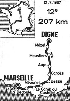 11h05 (Basses-Alpes) : Digne (km 0) - Châteauredon (km 11.5) - Mezel (km 14) - Estoublon (km 22) - La Bégude-Blanche (km 25.5) - Puimoisson (km 34.5) - Moustiers-Sainte-Marie (km 48) - Pont-d'Aiguines (km 54) - (Var) : Les Salles (km 58) - Aups (km 79) - Sillans-la-Cascade (km 88) - Cotignac (km 94) - Carcès (km 101) - Cabasse (km 112) - Besse-sur-Issole (km 124.5-ravitaillement) - Sainte-Anastasie (km 129) - Forcalqueiret (km 133.5-sprint) - Garéoult (km 136.5) - Méounes (km 144.5) - D2. Carr. Beaupré (km 150.5) - Signes (km 154.5) - Le Camp-du-Castellet (km 164.5) - (Bouches-du-Rhône) : Roquefort-Ia-Bédoule (km 179) - La Bédoule (km 184.5) - Col de la Gineste (km 197.5-GPM4) - Carr. Le Redon (km 203.5) - Marseille / stade-vélodrome (km 207.5).