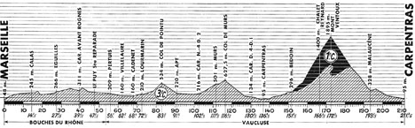 9h40 (Bouches-du-Rhône) : Marseille / Saint-Louis (km 0) - La Viste - Saint-Antoine (km 3) - Notre-Dame (km 5) - Septèmes (km 8) - Calas (km 14.5) - Saint-Pons (km 19) - Carr. Bompart (km 24) - Eguilles (km 27.5) - Lignane (km 30) - Carr. avant Rognes (km 39.5) - Le Puy-Sainte-Réparade (km 47.5) - (Vaucluse) : Pertuis (km 56) - Villelaure (km 62) - Cadenet (km 68) - Lourmarin (km 72.5) - Col de Pointu (km 83-GPM3) - Apt (km 91) - Murs (km 111.5-sprint) - Col de Murs (km 116.5) - Carr. près Venasque (km 125.5) - Carpentras (km 136.5) - Bédoin (km 151.5) - Saint-Estève (km 157) - Chalet-Reynard (km 166.5) - Mont-Ventoux (km 172) - Malaucène (km 193.5) - Serres - Carpentras / Bd de la Pyramide (km 211.5).