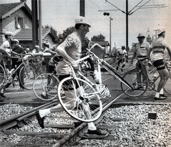 Le passage à niveau du km 34 scinde le peloton. Le train est passé et Pingeon et le reste du peloton traversent sous le regard d'un officiel (photo Miroir des Sports n° 1192 du 13 juillet 1967).