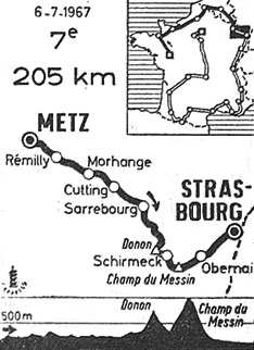 - Au ravitaillement de Sarrebourg (km 87), Lucien Aimar attaque en compagnie de Van Looy. Dans un premier temps Chappe et Alomar rappliquent puis ce sont Simpson, Castello, Wolfshohl, Janssen & Ignolin qui font également la jonction. Ce groupe s'assure 1' d'avance au km 95 mais derrière, Gimondi sonne la chasse et le regroupement a lieu avant le col du Donon. L'ascension est faite au train par un peloton groupé. Au sommet (km 124.5), Ignolin passe devant Jacquemin le leader de "la montagne".