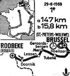 - Un peu plus loin, une cassure s'est produite et 11 hommes se retrouvent au commandement : De Vlaeminck, Merckx, Dancelli, Janssen, Gimondi, Van Springel, Wagtmans, Leman, Van Impe, De Witte et David. Ils s'assurent 1' d'avance à Herinnes (69 km), mais Pingeon et Poulidor contrent et les fuyards s'inclinent à Quenast (km 90). Roger Pingeon attaque à son tour avec Perez Frances en accompagnement passif. Les deux échappés possèdent 40" d'avance à Braine-le-Château (km 102). Cette fois Merckx et ses Faema réagissent et l'on assiste à un nouveau regroupement 12 km plus loin, à Braine-l'Alleud.