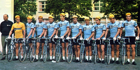 L'équipe SALVARANI au départ de ce Tour. Nota : photo prise alors que Rudi Altig est déjà en jaune (photo : Miroir du cyclisme n°116 de juillet 1969)