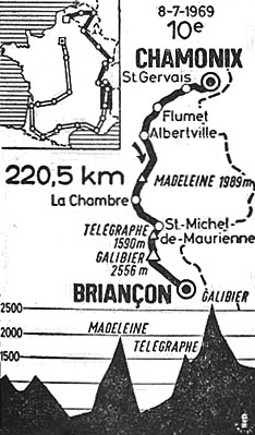 - Après 20 km de descente, sur le faux-plat montant menant aux premières rampes du Télégraphe, Janssen, Schutz, Dancelli, Santamarina, Polidori & Abrahamian passés avec 2'30" de retard à La Madeleine, ont refait leur retard. Au km 152, Gimondi entame en tête l'escalade qui va durer 11 kilomètres, sans à-coups, Galera et Gutty ne se détachant qu'au tout dernier kilomètre. Au col du Télégraphe (km 163.5), J. Galera et Gutty en tête, à 15" Gimondi, Merckx, Poulidor, Pingeon, Panizza, Gabica, Gandarias, ... tandis que Jan Janssen est à nouveau lâché. Avec Letort et Van Impe, il passe avec 4' de retard à Valloire (km 169), pied du Galibier.