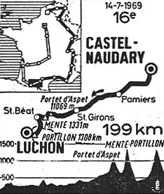- Chacun conserve ses positions dans la plongée vers Luchon et, le jour de la fête nationale, Delisle fait honneur à son maillot tricolore. Merckx termine 18" avant Pingeon et consolide un peu plus sa première place au C.G. avant la grande étape pyrénéenne de demain vers Mourenx.