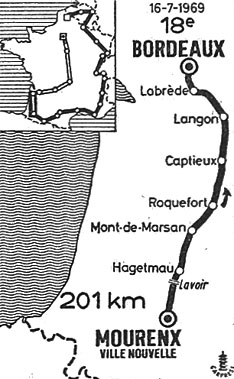 11h40 (Basses-Pyrénées) : Mourenx-VilIe Nouvelle (km 0) - D9 Lagor (km 2) - D31 Abidos - Lacq (km 8.5) - D31 Arthez-de-Béarn (km 16.5) - N646 Hagetaubin (près de) (km 22.5) - Lacadec - Sault-de-Navailles (km 27.5) - (Landes) : N133 Castaignos-Souslens (km 33.5) - Côte du Lavoir (km 36.5-GPM4) - Carr. Bellegarde (km 40) - Hagetmau (km 42) - Dumes (près de) (km 47.5) - Saint-Sever-sur-Adour (km 54) - Mont-de-Marsan (km 70) - N132 carr. Le Caloy (km 80) - Lucbardez (près de) (km 83) - Roquefort (km 92-ravitaillement) - Carr. près de Betjons (km 100) - Camp du Poteau (km 110) - (Gironde) : Captieux (km 121-sprint) - Beaulac (km 130.5) - Bazas (km 138) - Langon (km 153) - N113 Preignac (km 158) - Barsac (km 161) - Cérons (km 164) - Podensac (km 167) - Virelade (km 169.5) - Arbanats (km 171.5) - Portets (km 174) - Castres-Gironde (km 176) - Laprade (km 182.5) - Cadaujac-le-Bouscaut (km 189) - Pont de la Maye (km 193) - Bordeaux / Vélodrome Lescure (km 201).