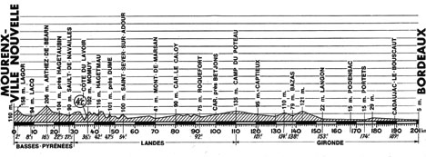 - Rudi Altig souffre du poignet et abandonne après 2 kilomètres, sous la canicule. Le début de course est très calme et seul le point-chaud du km 121 (Captieux) voit Leman l'emporter devant Perurena et Riotte. Du même coup, le Belge prend la tête de ce classement très disputé. Le peloton, toujours groupé à 80 kilomètres de Bordeaux, a une demi-heure de retard sur l'horaire prévu.