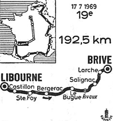 - Le peloton est nerveux en ce début d'étape avec de nombreux démarrages... sans conviction et qui ne donnent rien (Bodin, Genet, Swerts, Perurena, David etc.). Au km 37, Van Schil et Castello se dégagent et prennent 30" d'avance avant de capituler à Sainte-Foy-la-Grande (km 43). Puis le calme revient jusqu'au pied de la côte de Rivaux (km 138). Au sommet, Panizza passe en tête avec Catieau et Bodin dans son sillage. Le peloton emmené par Merckx et Vandenbossche suit à 10".