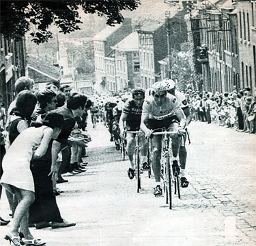 Eddy Merckx en jaune sera vigilant toute la journée devant des foules incroyables (photo Miroir-Sprint n° 1201B du 4 juillet 1969).