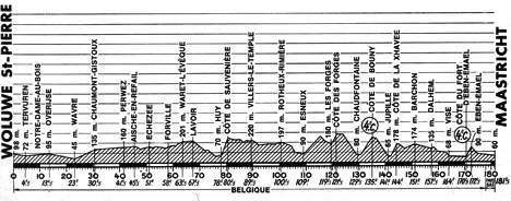 12h35 (BELGIQUE) - Woluwé Saint-Pierre / Av. Baron A. d'Huart (km 0) - Quatre-Bras (km 2) - Tervuren (km 4.5) - Notre-Dame-au-Bois (km 9) - N4 Overijse (km 13.5) - Tombeeck (km 16.5) - Wavre (km 23) - N43 Chaumont-Gistoux (km 30.5) - Carr. Thorembais (km 38.5) - Perwez (km 41.5) - N42 Aische-en-Refail (km 45.5) - Echezec (km 51) - N43 Forville (km 58-sprint) - Carr. Bierwart (km 61.5) - Waret-l'Evêque (km 63.5) - Héron (km 66) - Lavoir (km 67.5) - Ruy (km 78) - Côte de Sauvenière (km 80.5) - Outrelouxhe (km 86) - Villers-le-Temple (km 89.5) - Carr. 4-Bras (km 92) - Nandrin (km 93.5) - Rotheux Rimière (km 100.5-ravitaillement) - Ront-si-Plout (km 106) - Esneux (km 109) - Carr. près Gomze (km 116) - Les Forges (km 119.5) - Côte des Forges (km 121.5) - Beaufays (km 123.5) - Ninane (km 126.5) - Chaudfontaine (km 129.5) - Côte de Bonny (km 135-GPM4) - Romsee (km 135.5) - Beyne-Hensay (km 136.5) - Jupille (km 141) - Côte de la Xhavée (km 144) - Saive (km 145.5) - Henseux (km 149) - Barchon (km 151) - Dalhem (km 157.5) - Berneau (km 159) - Vise (km 164) - Lixhe (km 167.5) - Lanaye (km 170.5) - Côte du Fort d'Eben Emael (km 172.5-GPM4) - Eben-Emael (km 174.5) - Kanne - Nedercanne / frontière (km 178) - (PAYS-BAS) - Maastricht (km 181.5).
