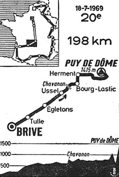 - Castello se lance à la poursuite de "la lanterne rouge" bien avant le pied du Puy de Dôme. Matignon souffre dans cette ascension. Derrière, Gutty démarre et provoque la réaction d'Eddy Merckx avec Vandenbossche, Poulidor et Gandarias dans son sillage. Pingeon perd le contact. Gimondi, lui, avait décroché dès les premières pentes sévères. Gutty et Merckx montent côte à côte et après Gandarias, c'est Poulidor qui perd pied à son tour. Plus haut, il sera rejoint puis débordé par Pingeon. Le maillot jaune s'envole seul à 500 mètres de la banderole mais trop tard pour revenir sur le valeureux Matignon qui conserve 1'25" d'avance et dont la victoire constitue la plus grosse surprise de ce Tour. Ce dernier avouera qu'il n'avait jamais autant souffert que dans le dernier kilomètre d'ascension.