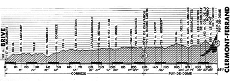 10h00 (Corrèze) : Brive (km 0) - N89 Malemort (km 1) - D44 carr. près Sainte-Ferréole (km 9) - Le Baronnet (km 12) - Lachamp (km 15) - D9 Tulle (km 27) - D23 Vimbelle (km 39) - Bar (près de) (km 42) - Corrèze (km 48) - D143 Vitrac (km 55.5) - Égletons (km 66-sprint) - D165 Soudeilles (près de) (km 73) - Le Gourgeat - Lapleau-Moussac (km 81) - Meymac (km 87) - N89 Ussel (km 103-ravitaillement) - Saint-Dézery (km 108) - Chalons (km 117.5) - Merlines (km 122) - Veyrières - (Puy-de-Dôme) : Côte de Chavanon (km 130-GPM4) - Bourg-Lastic (km 131) - N687 Lastic (km 140) - Chadeaux (km 143) - Herment (km 146) - Sauvagnat (km 150.5) - D204 La Narse (km 161.5) - Gelles (km 164.5) - Carr. la Miouze (km 171) - N686 Prades - Massagettes (km 174) - N89 Le Léry - Les Quatre-Routes-de-Nébouzat (km 182) - N141A col de la Moréno (km 187) - La Font-de-l'Arbre (km 192) - D68 Puy-de-Dôme (km 198-GPM1).