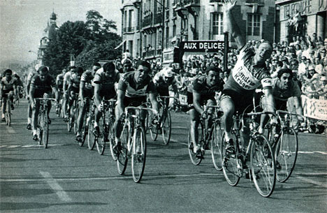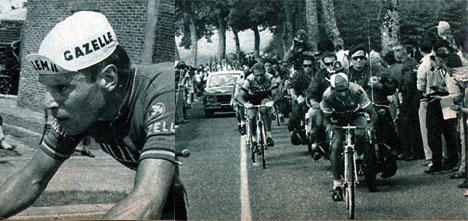A gauche, Timermann l'échappé du jour qui sera rattrapé par Agostinho que l'on voit ici se faire rejoindre par le groupe "Altig" à quelques kilomètres de l'arrivée à Charleville (photo Miroir-Sprint n° 1201B du 4 juillet 1969).
