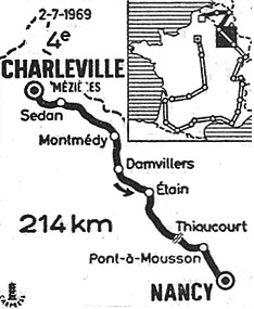 - Entre Gremilly (km 96) et Maucourt sur Orme, Van Looy passe à l'attaque et relance la course alors que le calme régnait depuis une vingtaine de kilomètres. Le peloton ne réagit pas et le "vieux" Rik possède déjà 2'30" d'avance à Etain (km 112) et... 7' treize kilomètres plus loin. Son avantage passe à 8'25" à Saint-Hilaire (km 132) où il est virtuel maillot jaune, 9'15" à Woël et 12'25" à Saint-Benoît (km 146). Ce sera là son avance maximum. Le peloton réagit et à Thiaucourt (km 153) elle est encore de 11'15". Van Looy se bat magnifiquement mais à Pont-à-Mousson (km 171), il n'a plus que 8'45"d'avance. Derrière, Stevens défend son maillot jaune et se retrouve à l'avant avec un groupe comprenant Pijnen, Mintjens, Berland, Letort, Zandegu, Panizza & Perez Frances. A Nomény (km 186), Van Looy a 6'25" à son compteur qu'il va quasiment perdre progressivement. La fin de course est très dure pour champion belge mais il parvient à conserver 42" sur la ligne à Nancy. Le maillot jaune prend la 2ème place du groupe de poursuite où Pijnen et Perez Frances se sont auparavant frictionnés et le Belge se retrouvant dans le fossé. L'Espagnol prend 5' de pénalité qui le rétrogradent au classement général.