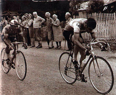 Dans la descente du col de la Schlucht, rendue dangereuse par les orages, Charly Grosskost (Bic) et Joaquim Agostinho se sont détachés. Malheureusement, l'Alsacien va crever et va devoir laisser partir son compagnon vers la victoire (photo Miroir-Sprint n° 1202A du 8 juillet 1969).