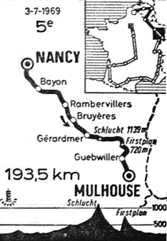 12h00 (Meurthe-et-Moselle) : Nancy -Jarville / rue de la République (km 0) - N4 Laneuveville (km 4.5) - Saint-Nicolas-de-Port (km 9) - Manoncourt-en-Vermois (km 13) - D112 Ferrières (km 13.5) - Saint-Mard (km 26) - Lorey - D9 Bayon (km 29.5) - D22 Rozelieures (km 39.5) - Vennexey (près de) (km 42.5) - Mattexey (km 46.5) - Magnières (km 50.5) - (Vosges) : N414 Saint-Pierremont (km 51.5) - Roville-aux-Chênes (km 58) - Rambervillers (km 63.5) - D48 Sainte-Hélène (km 70) - Grandvillers (km 76.5) - N423 Bruyères (km 82.5) - Laveline-devant-Bruyère (km 87.5-sprint) - Aumontzey (km 89.5) - Granges-sur-Vologne (km 92.5-ravitaillement) - Les Evelines - Le Kertoff - Kichompré - Gérardmerr / La Croisette (km 103.5) - N417 Xourupt-Longemer (km 106.5) - Roche-du-Diable - Col de la Schlucht (km 117-GPM3) - (Haut-Rhin) : Soultzeren (km 129) - Stosswihr (km 132.5) - Munster (km 135) - D10 Gunsbach (km 137.5) - Wihr-au-Val (km 140) - Soultzbach-Ies-Bains (km 141) - D40 col de Firstplan (km 148.5-GPM3) - Osenbach (km 154.5) - Soultzmatt (km 157.5) - D40 col de Banstein (km 162) - Schweighouse (km 164) - D430 Buhl (km 165) - Guebwiller (km 168) - Soultz (km 171) - BolIwiller (km 175) - Pulversheim (km 179.5) - Bourtzwiller (km 180.5) - D38 Illzach (km 186.5) - Modenheim (km 191.5) - N422 Mulhouse / Pl. du 14 Juillet (km 193.5).
