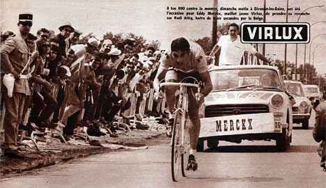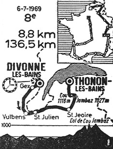 - Merckx domine la 1ère partie (4 km en 5'31") mais Altig reprend du temps dans la seconde partie et menace le Bruxellois jusqu'au bout. Pas de surprise sur ce contre-la-montre de 8.8 kilomètres autour du lac de Divonne-les-Bains, les deux meilleurs rouleurs prennent les deux premières places... avec cette fois-ci Merckx devant Altig pour 2".