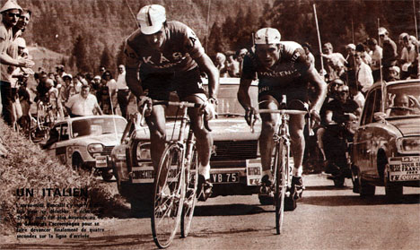 Andres Gandarias suivi de Michele Dancelli dans le col de Cou. L'Espagnol ne pourra apporter une nouvelle victoire à son pays. Il sera battu par l'Italien (photo Miroir-Sprint n° 1202A du 8 juillet 1969)