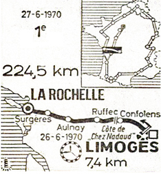 10h50 (Haute-Vienne) : Limoges (km 0) - N141 La Croix de Landouge (km 2-GPM4) - Le Breuil (km 6.5) - Beauvallet - N141 Carr. D9 (km 12.5) - D9 Carr. D28 (km 15) - Carr. Puy Gaillard (km 20) - D3 Oradour-sur-Glane (km 21) - D9 La Fauvette - D9 Carr. N675 Chêne-Piguier (km 31) - (Charente) : D82 Carr. près de Montrollet (km 34.5) - Saint-Christophe (km 39.5) - Lesterps (km 45.5) - D30 Confolens (km 54) - Côte de Chez-Nadaud (km 58-GPM4) - N148 - N740 - Lasfont - Alloué (km 68) - La Réchaudie - Chapagne-Mouton (km 78-CV) - Nanteuil-en-Vallée (km 86) - Condac (km 94-sprint) - Ruffec (km 97) - Veillemorte - La Faye (km 101.5) - Villefagnan (km 107) - D9 Brettes - N737 Longré (km 115.5) - (Deux-Sèvres) : D52e Couture-d'Argenson (km 121.5) - (Charente-Maritime) : D130 Carr. près de Villiers-Couture (km 126.5) - La Touche (km 127) - Romazières (km 128.5) - Les Eduts (près de) (km 131.5) - Néré (km 134-ravitaillement) - D133 Aulnay-en-Saintonge (km 144) - D121 Saint-Georges-de-Longuepierre (km 149.5) - Dampierre-sur-Boutonne (km 152.5) - D115 Coivert (km 155.5) - Tout-y-Faut / Carr. N138 (km 160) - La Cavalerie - D115 Carr. D120 (km 167) - D115 Saint-Félix (km 168) - Boisseuil (km 174) - D111 Surgères (km 180-CV) - D115 Vouhé (km 186.5) - D108 - D115 Carr. D116 (km 191) - D116 Bouhé (km 192.5) - D107 Fraise - Fontpatour (km 200.5) - Bourgneuf (km 206) - Carr. Belle-Croix (km 208.5) - Dompierre (km 210) - Saint-Xandre (km 214) - L'Aubreçay (km 217) - V.O 1 - La Rochelle (km 224.5).