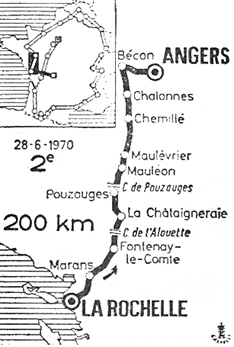11h15 (Charente-Maritime) : La Rochelle (km 0) - D9 Puilboreau (km 2) - Saint-Xandre (km 4) - Villedoux (km 9.5) - D20 Andilly (km 12.5) - Sérigny (km 14) - N137 Marans (km 19) - N137 Carr. N138ter (km 21) - (Vendée) : N138ter Île d'Elle (km 24.5) - N138ter Carr. D25 (km 33) - Fontenay-le-Comte (km 45) - Pissotte (km 49) - Fourchaud (km 52) - Carr. Côte de l'Alouette (km 57.5-GPM4) - La Châtaigneraie (km 67) - N149bis Cheffois (km 71.5) - N752 Réaumur (km 77.5) - Pouzauges (km 85) - Côte de Pouzauges (km 85.5-GPM4) - D43 La Pommeraie-sur-Sèvre (km 94) - (Deux-Sèvres) : D34 Saint-Amand-sur-Sèvre (km 98) - N148bis Mauléon (km 106-CV) - D41 Saint-Pierre-des-Échaubrognes (km 113.5-sprint) - (Maine-et-Loire) : D20 Maulévrier (km 116) - D65 Vezins (km 129) - La Tourlandry (km 132-ravitaillement) - D65 Carr. N756 - N756 Chemillé (km 141) - N761bis La Jumellière (km 149) - Les Quatre Routes (km 153) - Chalonnes-sur-Loire (km 158-CV) - Saint-Georges-sur-Loire (km 155) - Saint-Augustin-des-Bois (km 172) - Bécon-les-Granits (km 177) - N163 Carr. D104 (km 177.5) - D104 Saint-Clément-de-la-Place (km 182.5) - D103 Saint-Jean-des-Marais (km 185.5) - La Meignanne (km 189) - D122 Avrillé (près de) - Angers / Pl. La Rochefoucauld (km 200).