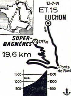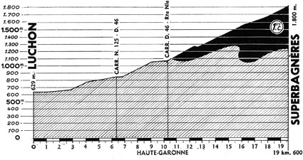 15h00 (Haute-Garonne) : 0 Luchon (km 0) - N125 Carr. D125-D46 (km 6.3) - Carr. D46-rte nouvelle (km 10.3) - Superbagnères (km 19.6).