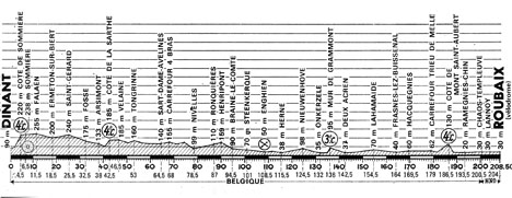 11h40 (BELGIQUE) - Dinant (km 0) - Bouvignes (km 1.5) - Côte de Sommière (km 4.5-GPM4) - Sommière (km 6.5-P.C) - Falaën (km 11.5) - Carr. La Motte (km 16.5) - N51 Ermeton-sur-Biert (km 18.5) - Saint-Gérard (km 25.5) - Fosse (km 32.5) - Arsimon (km 38) - Auvelais (km 41.5) - Côte de la Sarthe (km 42.5-GPM4) - Velaine (km 46.5) - Boignée (km 50.5) - Tongrinne (km 53) - Carr. Le Docq (km 54.5) - N49 Sombreffe (km 56) - Brye (près de) (km 59) - Sart-Dame-Avelines (km 64.5) - Carr. des 4-Bras (km 68) - Houtain-Le Val (km 71) - Thines (près de) - Nivelles (km 78.5) - Ronquières (km 87) - Henripont (km 90) - Braine-le-Comte (km 94.5) - Petit-Roeulx-les-Braine (km 98) - Steenkerque (km 101) - Hoves (km 105.5) - Enghien (km 108.5-ravitaillement) - Carr. Coquiane (km 111.5) - Herne (km 115.5) - Vollezele (km 118.5) - Nieuwenhove (km 124.5) - Zandbergen (km 127.5) - Grimminge (km 129) - Oukerzele (km 132) - Grammont (km 135) - Mur de Grammont (km 136-GPM3) - Deux Acren (km 142.5) - Lessines (km 146.5) - N60 Lahamaide (km 154.5) - Frasnes-lez-Buissenal (km 164) - Moustier-les-Frasnes (km 166) - Hacquegnies (km 169.5) - Quartes (km 176) - Carr. Trien de Melle (km 179) - Mourcourt (km 181.5) - Côte Mont-St-Aubert (km 185-GPM4) - Kain (km 188.5) - Pont-à-Chin (km 192.5) - Ramegines-Chin (km 193.5) - Templeuve (km 197.5) -