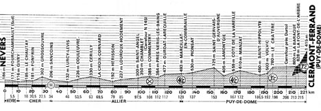 9h40 (Nièvre) : Nevers (km 0) - D40 Fourchambault (km 5.5) - (Cher) : Givry - Le Chautay (km 16) - D218 Le Gravier (km 18.5) - Fonfrin (km 20.5) - N720 La Chapelle-Hugon (km 24.5) - Grossouvre (km 27.5) - Sancoins (km 34-P.C) - (Allier) : Lurcy-Lévi (km 46) - D3 Couleuvre (km 53.5) - Cerilly (km 63) - La Croix Cornard (km 69.5) - Hérisson (km 79) - D39 Louroux-Hodement (km 85) - Carr. Croix-de-Fragne (km 94.5) - Saint-Angel (km 97.5) - Chamblet (km 100) - D37 Commentry (km 106) - N143 Durdat-Larequille (km 117) - Le Teray - D409 Côte de Marcillat-en-Combraille (km 129-GPM4) - (Puy-de-Dôme) : N 689 Le Marturet - D60 Pionsat (km 137) - Saint-Gervais-d'Auvergne (km 153) - La Montgie (km 160) - Côte de la Vareille (km 167-GPM4) - La Vareille (km 168) - Manzat (km 172) - Rochepradière (km 185) - Saint-Hippolyte (km 186.5) - D15 Crouzol - N686 Volvic (km 192) - Le Cratère (km 196-GPM3) - Chamalières (km 208) - N141A La Baraque (km 213) - La Font-de-l'Arbre (km 215) - D68 Le Puy-de-Dôme (km 221-GPM1).